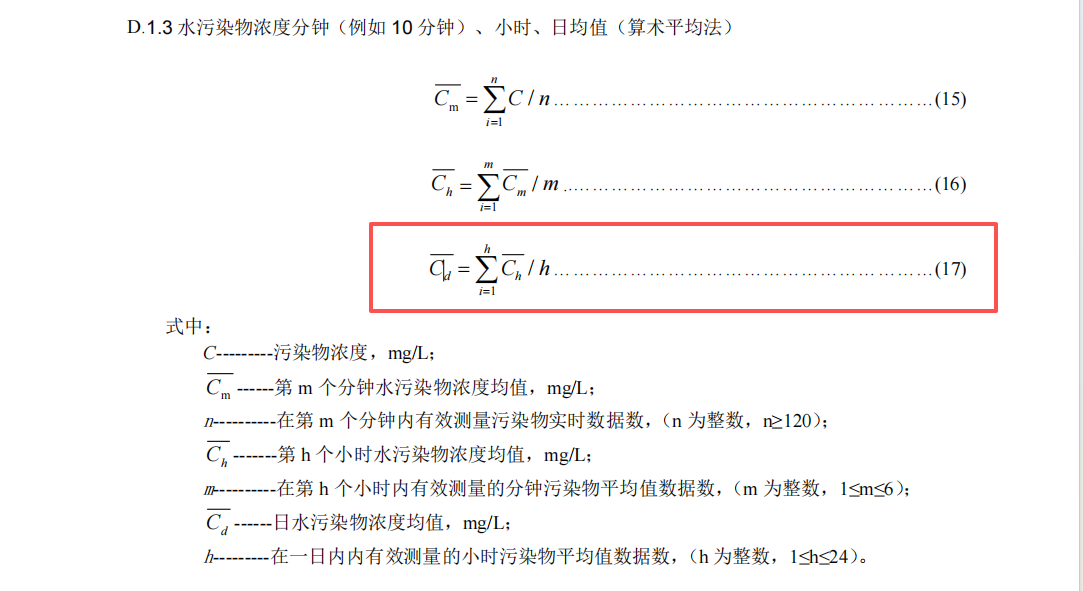 HJ 212—2017 水污染物浓度分钟、小时、日均值(算术平均法) 计算公式